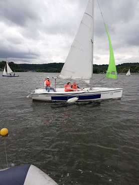 Für die segelpraktische Ausbildung haben wir mehrere Jollen an dem Baldeneysee in Essen liegen. Dort findet jeden SA und SO der Unterricht von 10 - 14 Uhr statt. Nach 20 Zeitstunden ist die Prüfungsreife erreicht.